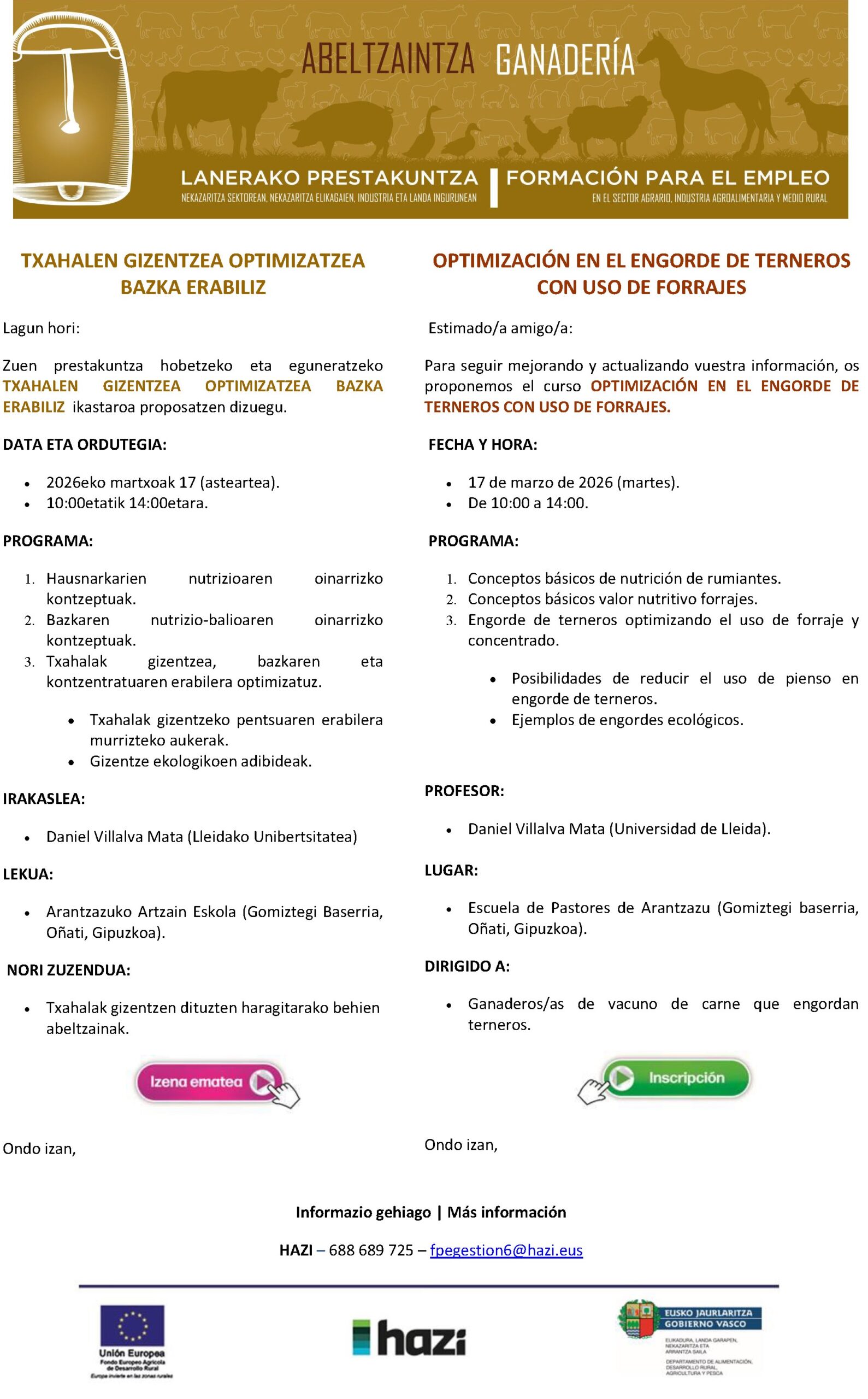 Para seguir mejorando y actualizando vuestra información, os proponemos el curso OPTIMIZACIÓN EN EL ENGORDE DE TERNEROS CON USO DE FORRAJES.