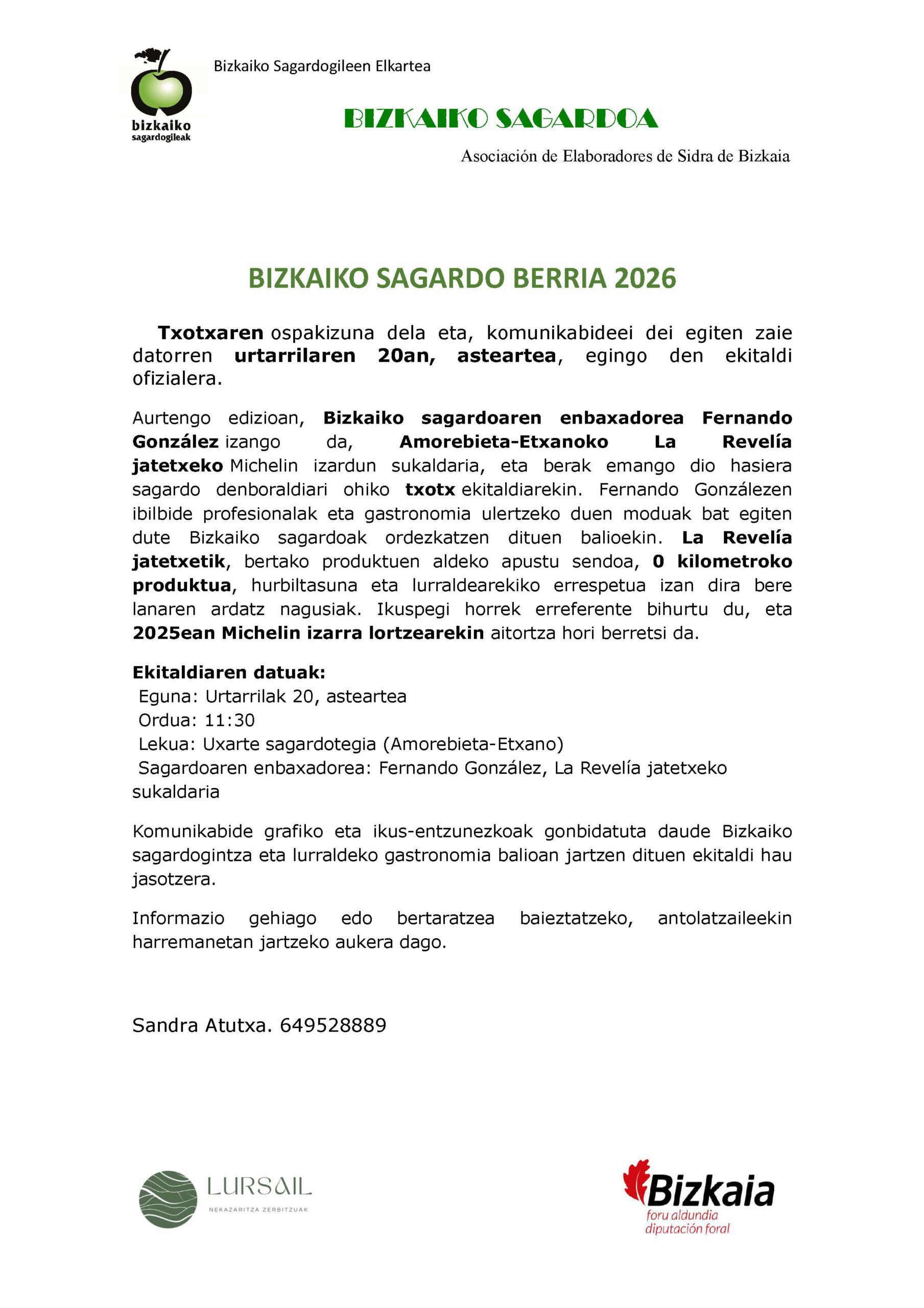 Txotx denboraldi berria dela eta, Bizkaiko Sagardogileen Elkarteak “2026ko BIZKAIKO SAGARDOAREN DENBORALDI HASIERA” ekitaldira gonbidatzeko atsegina dauka.