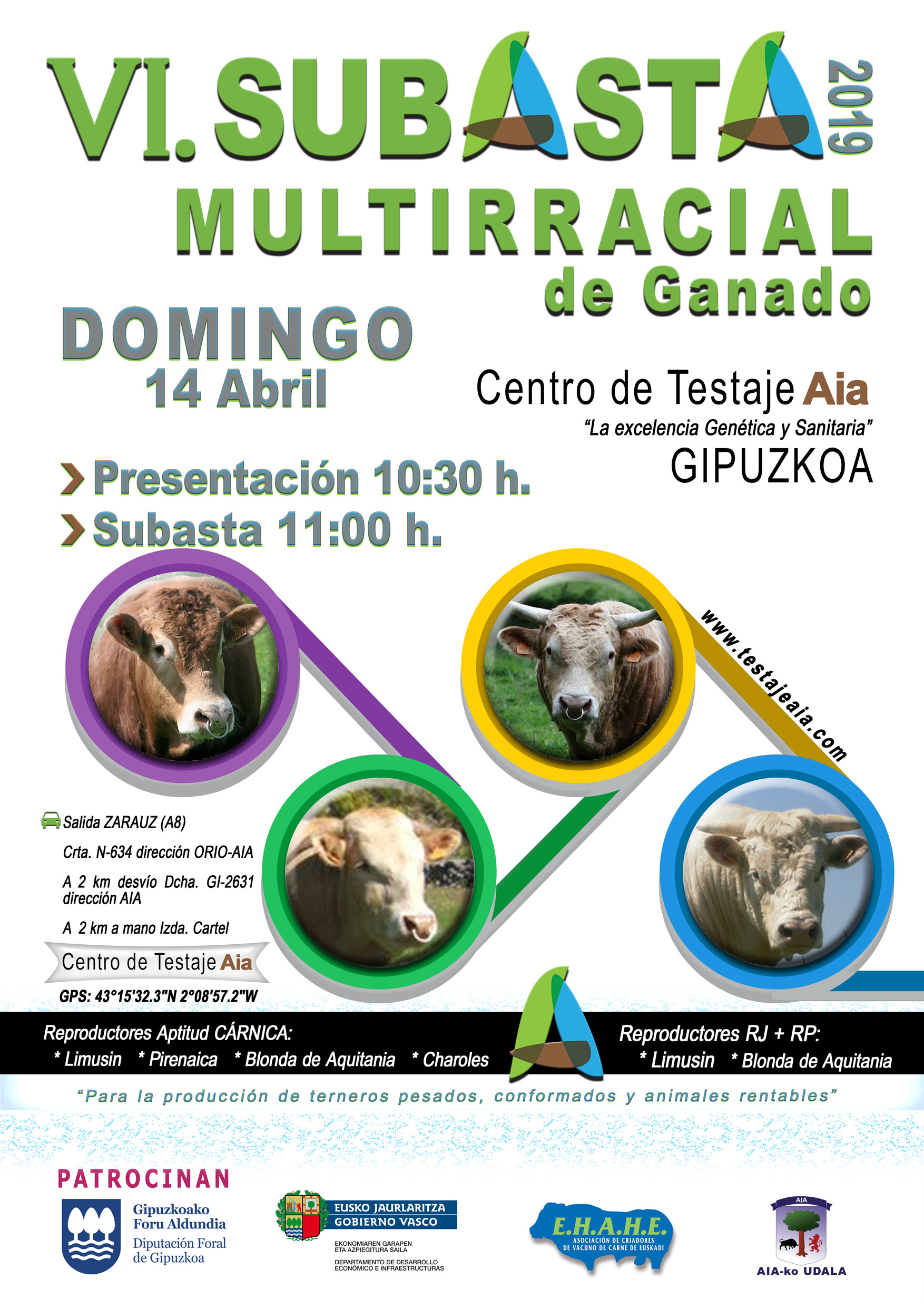 Deskribapena: Datorren igandean, Apirilaren 14an, 10:30etik aurrera, Aiako Testaje Zentroan (Gipuzkoa) VI. Idiskoen Enkantea izango dela. Pirenaika, Limusina, Txarolesa eta Blonda arrazetako haragitarakoak eta ugalketarako gazteen (RJ + RP) Limusin eta Blonda arrazakoak.