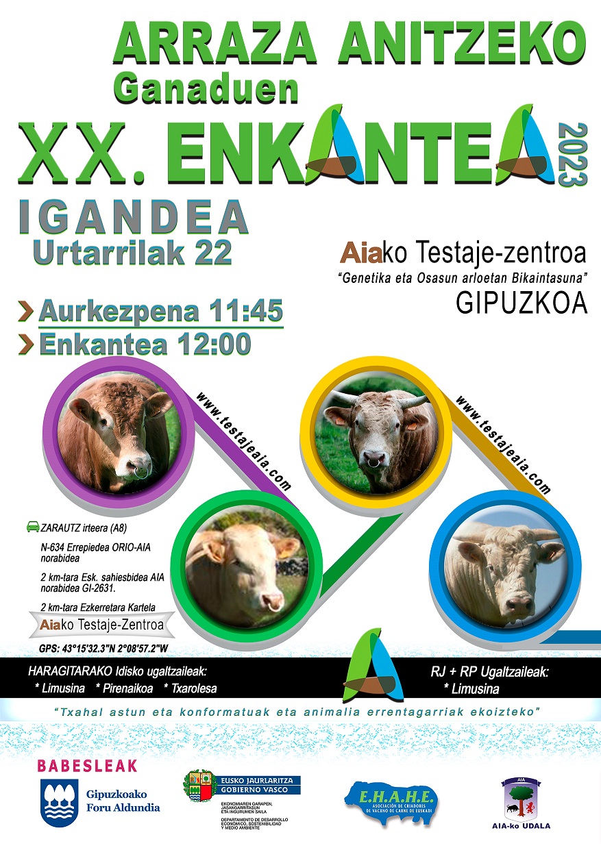 Aipatutako egunean, urtarrilaren 22an, haragitarako behi-aziendei inguruan guztion artean eta erakundeen laguntzarekin (Gipuzkoako Foru Aldundia eta Eusko Jaurlaritza) XX. Enkante honetan parte hartzera gonbidatzen zaitugu, gure azienden amaierako produktuak hobetzeko asmoarekin, ugalketakoari zein haragitarakoari dagokionez.