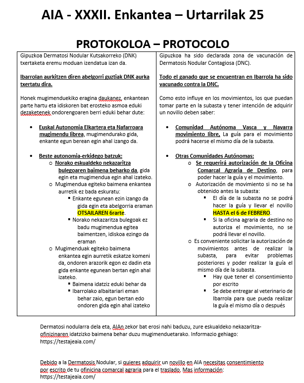 Deskribapena: Datorren igandean, urtarrilaren 25an, Aiako Testaje Zentroan (Gipuzkoa) XXXII. Idiskoen Enkantea izango dela. Limusin, Pirenaika, Blonda eta Txarolesa arrazetako haragitarakoak eta ugalketarako gazteen (RJ + RP) Limusin eta Blonda arrazakoak.