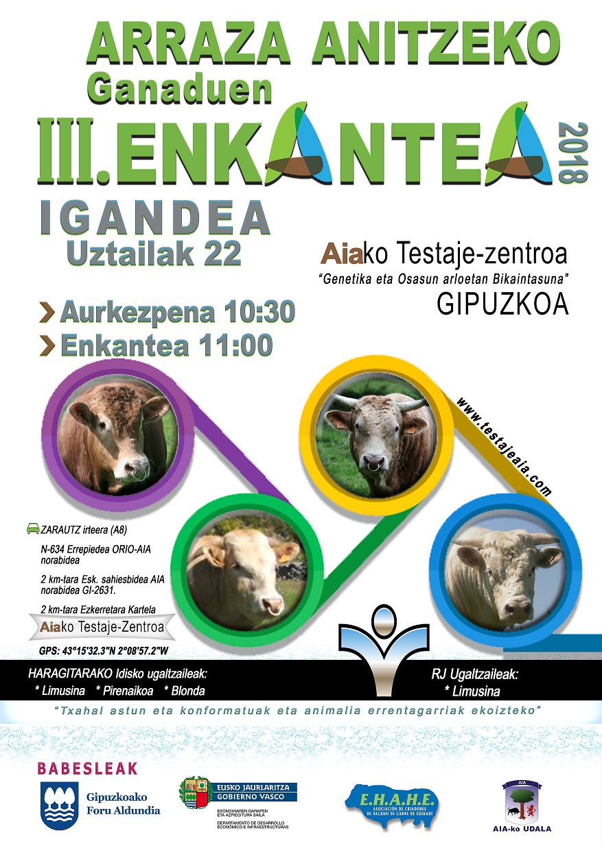 Deskribapena: Datorren igandean, uztailaren 22an, 10:30etik aurrera, Aiako Testaje Zentroan (Gipuzkoa) III. Idiskoen Enkantea izango dela. Pirenaika, Limusina eta Blonda arrazetako haragitarakoak eta ugalketarako gazteen (RJ) Limusin arrazakoa.