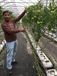 Tiene un invernadero de 5000 m2. Cultiva tomate variedad Jack en una superficie de unos 4.500 m2 y Pimiento de Gernika, variedad Derio, en unos 500 m2.