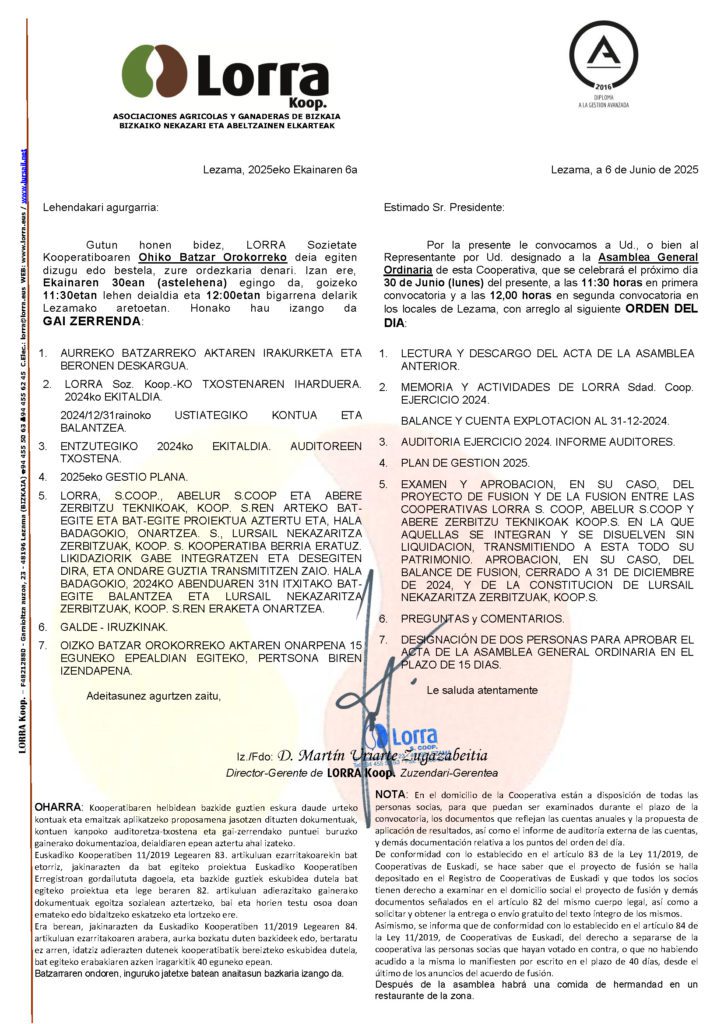 - EXAMEN Y APROBACION, EN SU CASO, DEL PROYECTO DE FUSION Y DE LA FUSION ENTRE LAS COOPERATIVAS LORRA S. COOP, ABELUR S.COOP Y ABERE ZERBITZU TEKNIKOAK KOOP.S. EN LA QUE AQUELLAS SE INTEGRAN Y SE DISUELVEN SIN LIQUIDACION, TRANSMITIENDO A ESTA TODO SU PATRIMONIO. APROBACION, EN SU CASO, DEL BALANCE DE FUSION, CERRADO A 31 DE DICIEMBRE DE 2024, Y DE LA CONSTITUCION DE LURSAIL NEKAZARITZA ZERBITZUAK, KOOP.S.