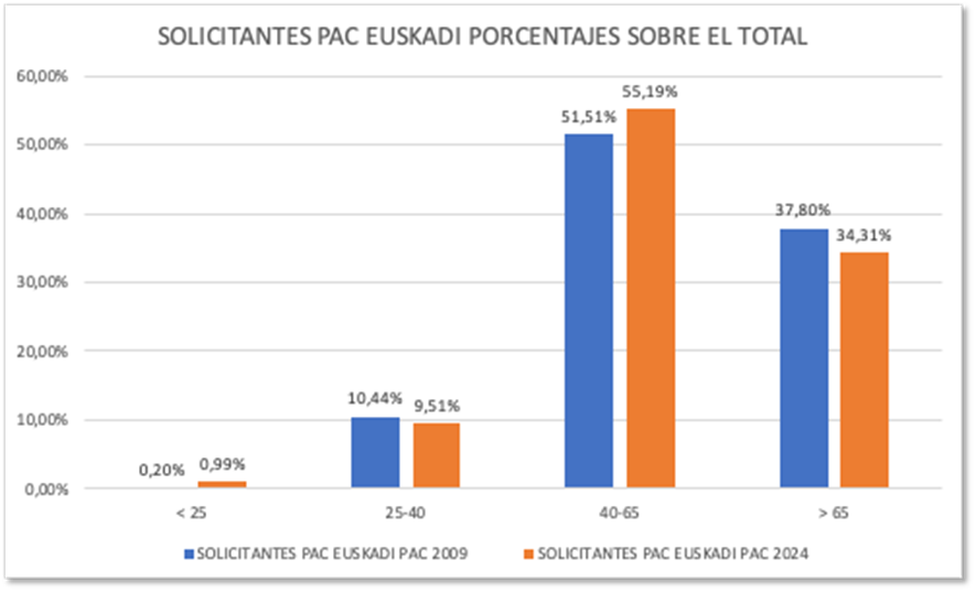 El porcentaje de jóvenes –segúnla política agraria europea menores de 40 años- se mantiene estable: pasa del 10,64% en 2009 al 10,5% en 2024, pero se produce en un contexto de fuerte caída del número total de solicitantes, lo que evidencia que el relevo generacional no está garantizado.