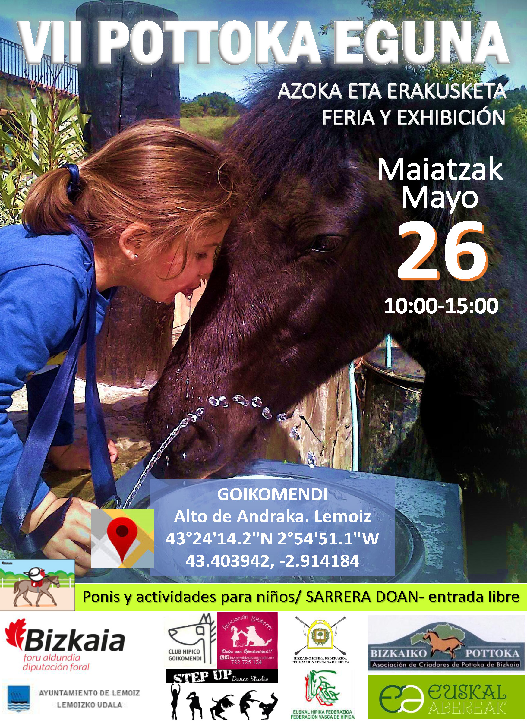 El Pottoka Eguna es una feria exhibición, organizada por la asociación de criadores de Bizkaia y el club hípico Goikomendi. Tendrá lugar el próximo 26 de mayo en la finca Goikomendi del alto de Andraka, en Lemoiz.