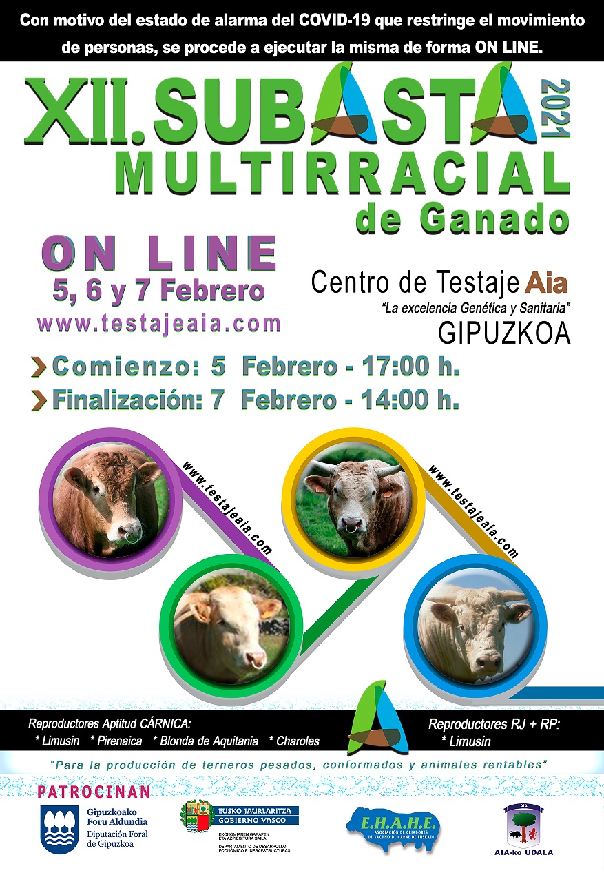 XII Subasta de AIA y la segunda ONLINE de sementales de las razas Limusin, Pirenaica y Charoles procedentes del Centro de Testaje de AIA (Gipuzkoa) los días 5, 6 y 7 de Febrero.