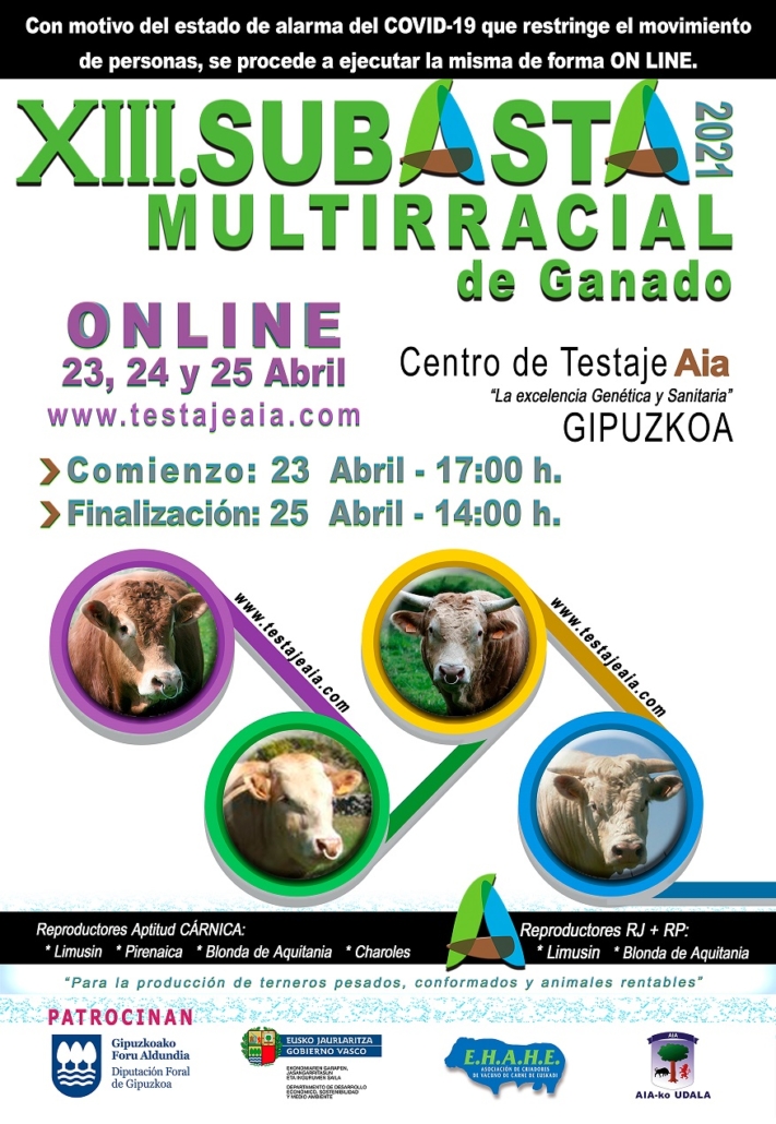 Debido a la problemática surgida por la situación actual motivada por la COVID-19, la SUBASTA de novillos-sementales del Centro de Testaje de AIA (Gipuzkoa) se realizará ONLINE los días 23, 24 y 25 de Abril.