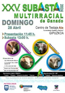 Te invitamos a participar este día, 28 de abril, domingo, en esta XXV Subasta alrededor del vacuno de carne con la ayuda de las instituciones (Diputación Foral de Gipuzkoa y Gobierno Vasco) con el interés de mejorar los productos finales de nuestra cabaña ganadera, tanto en la producción de vida como de carne.